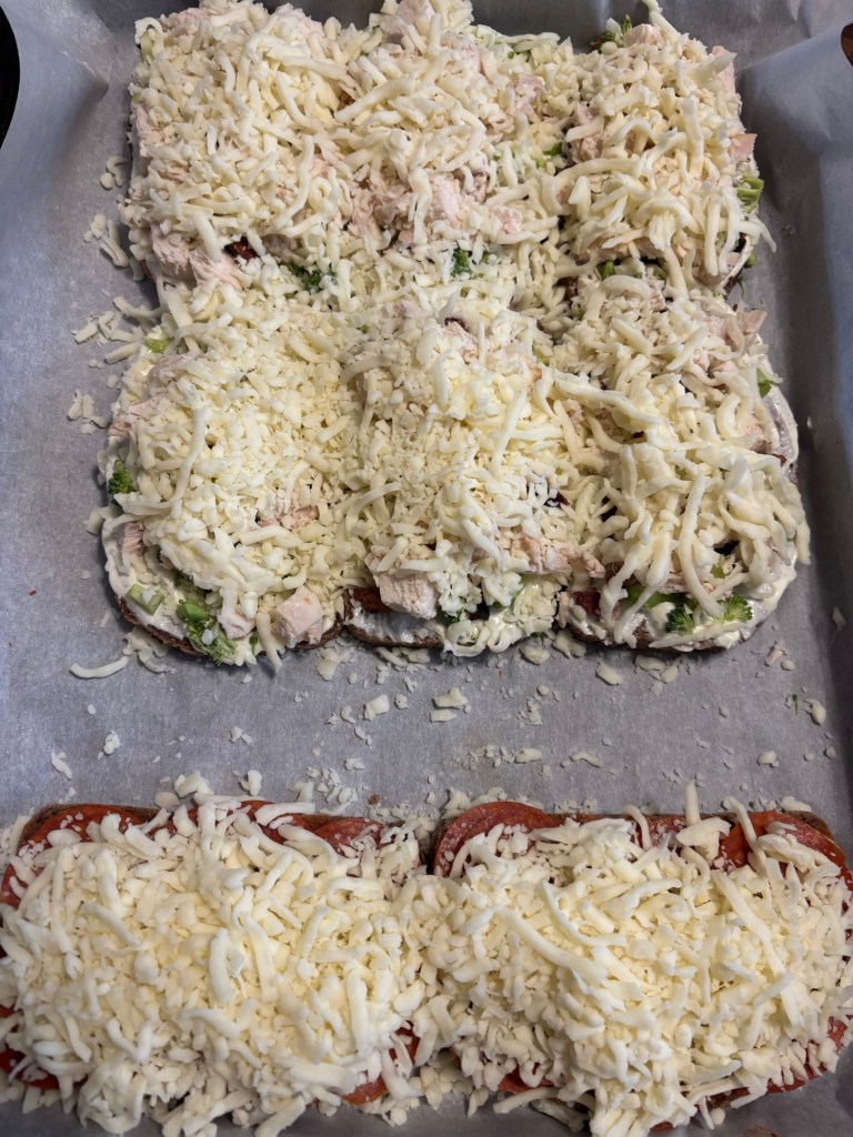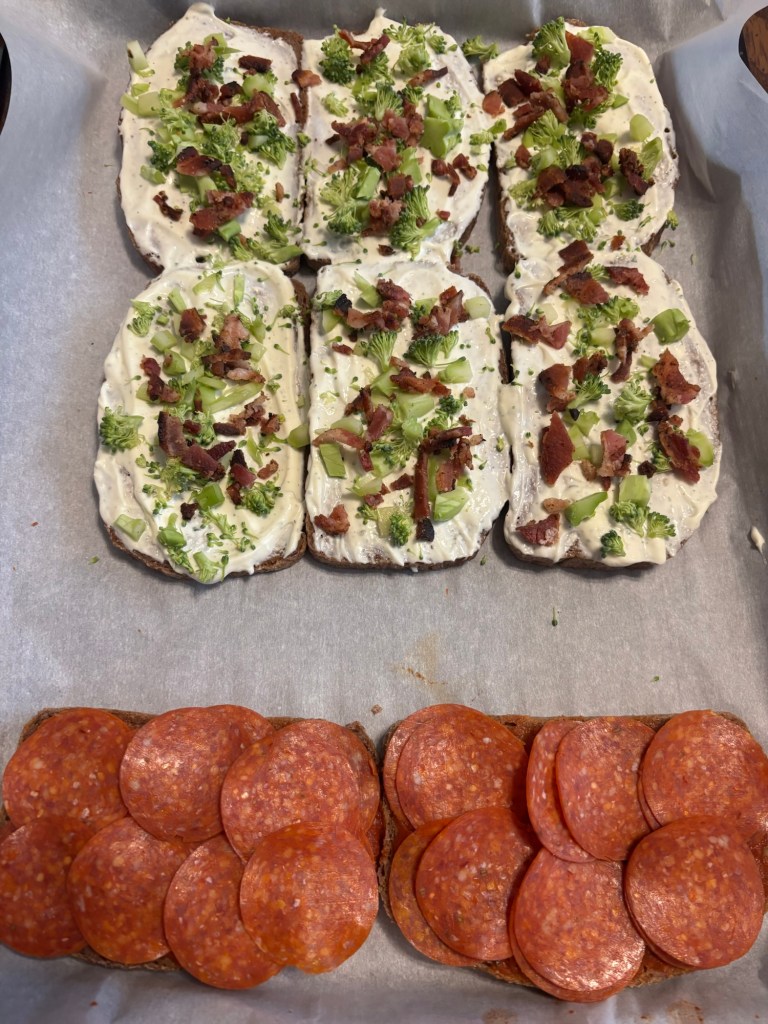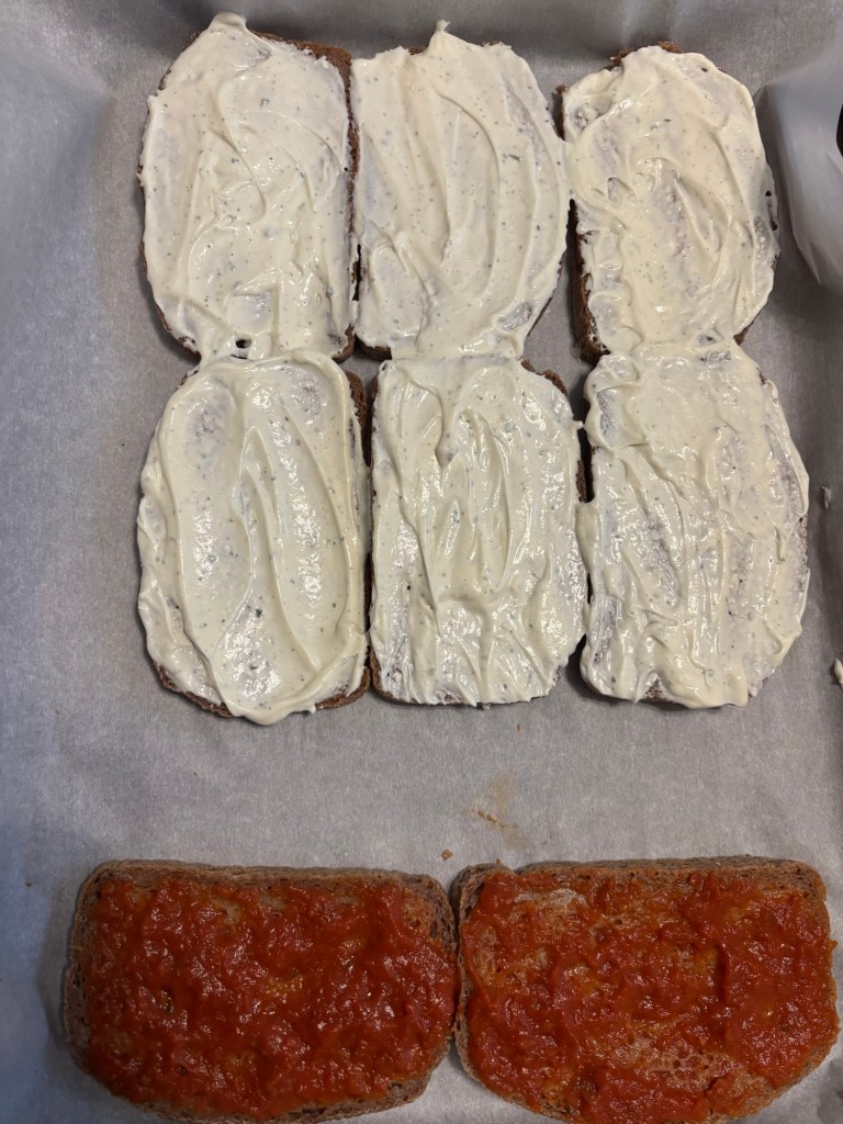 So easy, just slice your gluten free sourdough bread into relatively similar sized slices. Line a cookie sheet with parchment paper. You now have the freedom to use your own choice of sauce and toppings. So many options!! Preheat oven to 375 degrees.